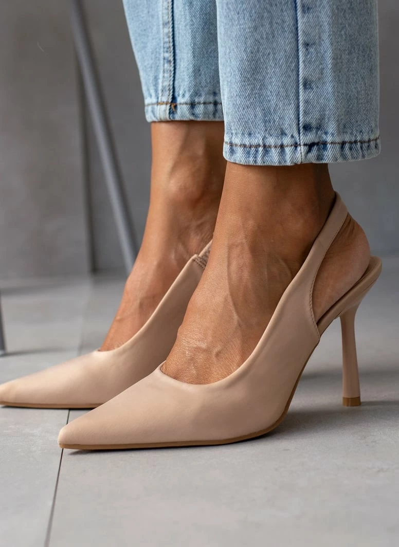 Γόβες σατέν με ανοιχτή φτέρνα. Έχουν διακριτικό λάστιχο στην εσωτερική τους πλευρά για καλύτερη εφαρμογή. Μυτερή φόρμα.