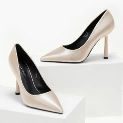 Γόβες σατέν σε μυτερή φόρμα. Έχουν λεπτό γυαλιστερό τακούνι.