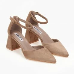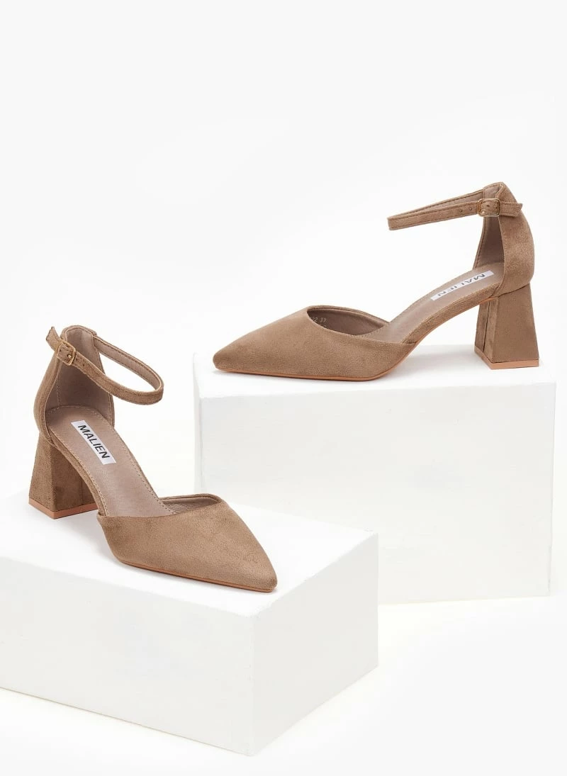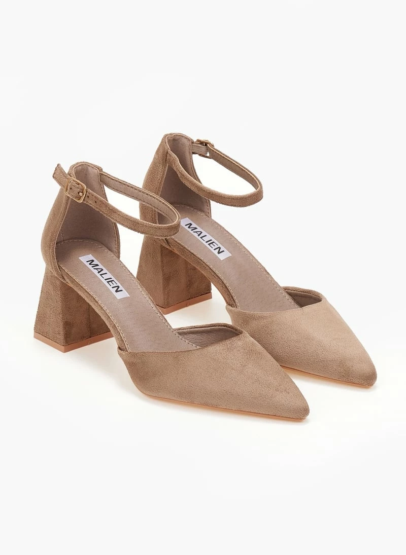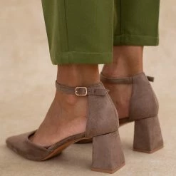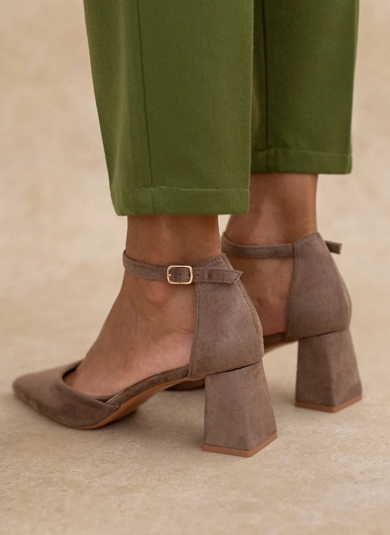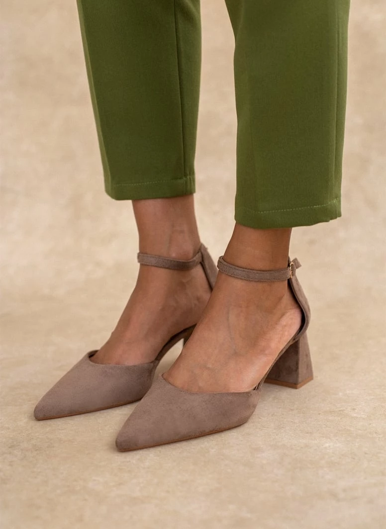 Γόβες μυτερές suede με ανοιχτά πλαΙνά. Έχουν κλειστή φτέρνα. Δένουν με μπαρέτα στο ύψος του αστραγάλου. Χαμηλό χοντρό τακούνι.