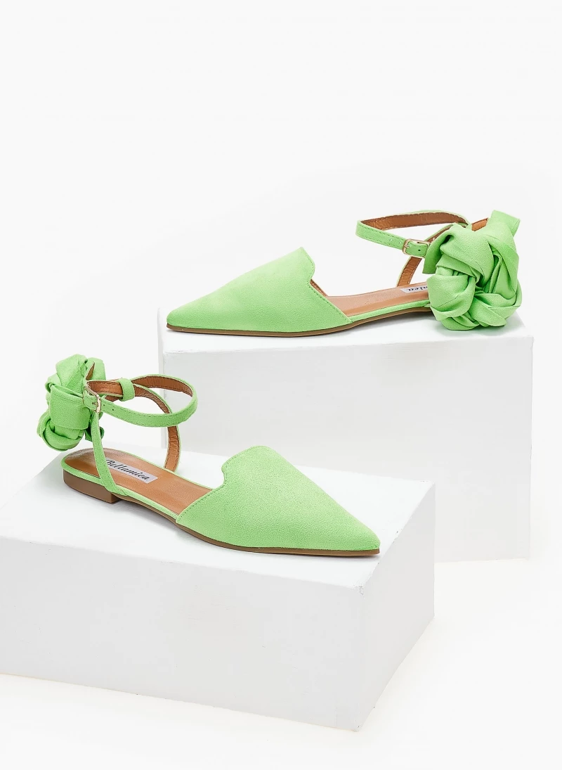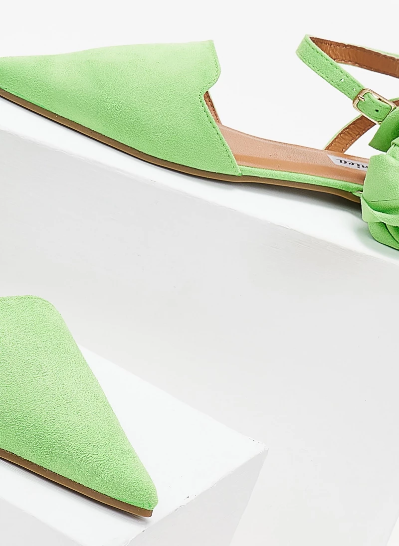 Μπαλαρίνες mules μυτερές suede με μπαρέτα. Δένουν με φαρδιά κορδέλα στη γάμπα. Η κορδέλα μπορεί να αφαιρεθεί.