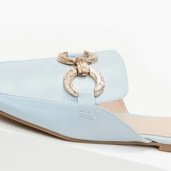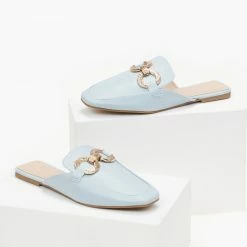 Mules σε καρέ γραμμή χωρίς τακούνι.Έχουν διπλό μεταλλικό κρίκο.Μαλακή σόλα από λάστιχο.