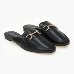 Mules χωρίς τακούνι με μεταλλικό διακοσμητικό.Έχουν εξωτερική ραφή στη μπροστινή πλευρά.