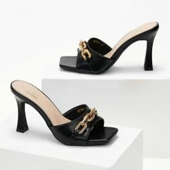 Mules με αλυσίδα στη φάσα. Καρέ γραμμή. Λεπτό ψηλό τακούνι.
