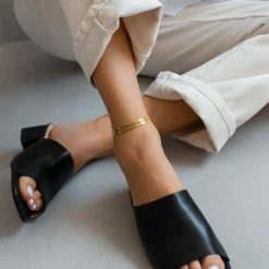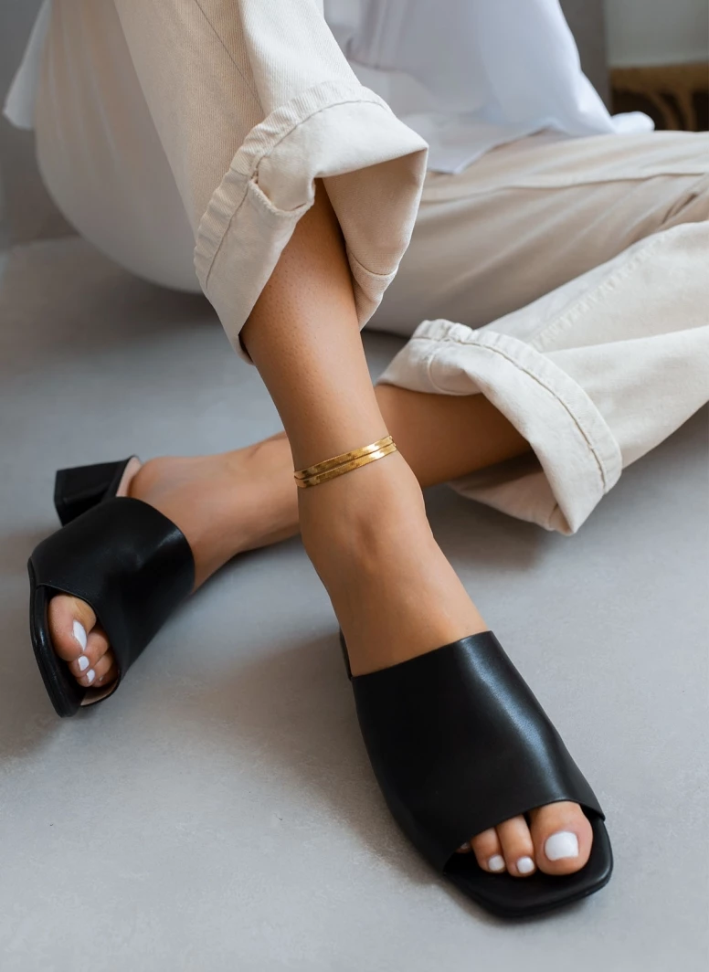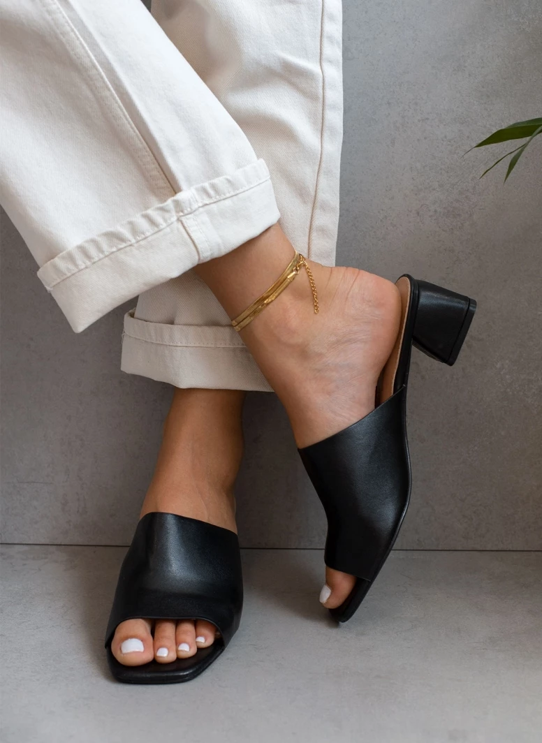 Mules με φαρδιά χωστή φάσα.Έχουν χαμηλό τετράγωνο τακούνι.Καρέ γραμμή.
