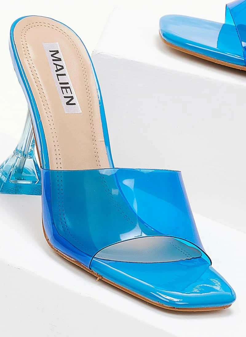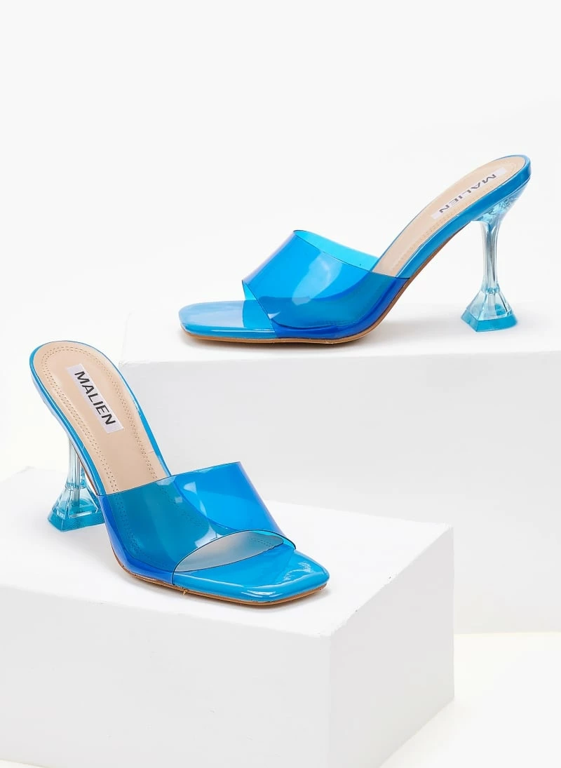 Mules πέδιλα σε καρέ γραμμή. Έχουν διάφανη φάσα και ιδιαίτερο τακούνι.