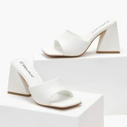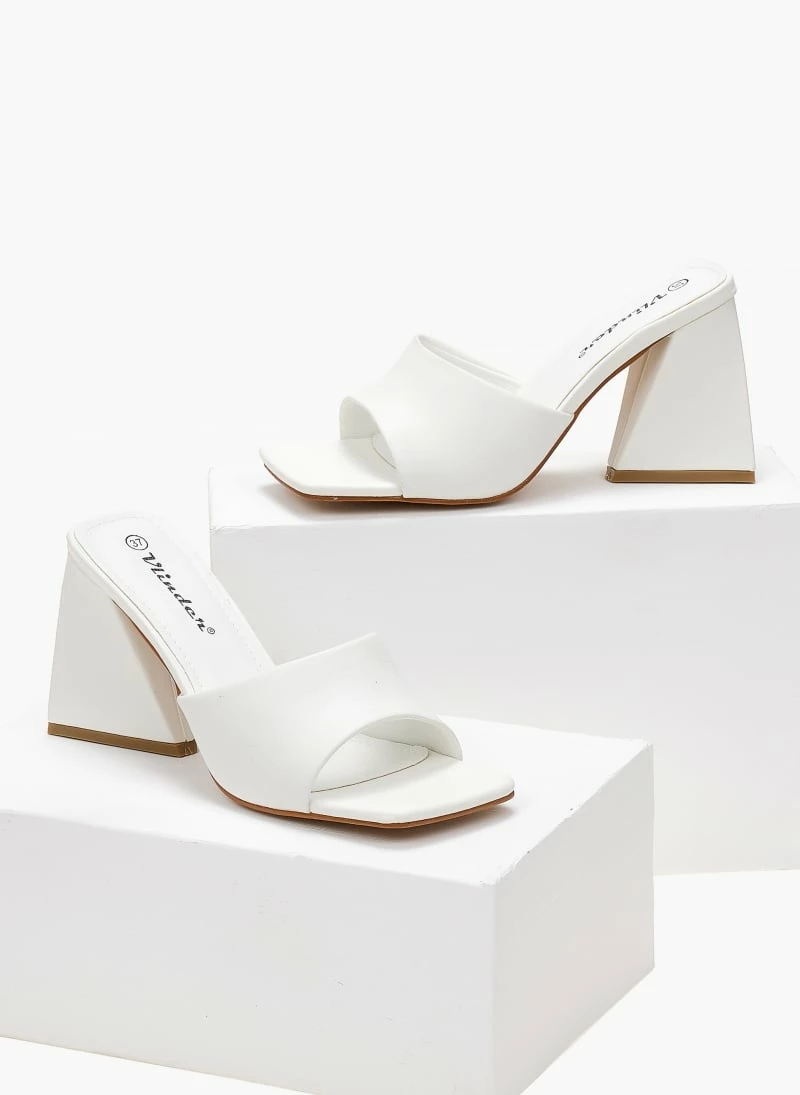 Mules με ψηλό τακούνι σε τριγωνικό σχήμα. Έχουν καρέ γραμμή.