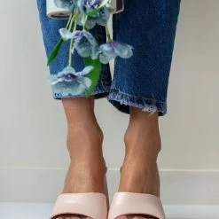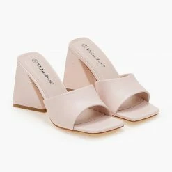Mules με ψηλό τακούνι σε τριγωνικό σχήμα. Έχουν καρέ γραμμή.