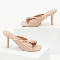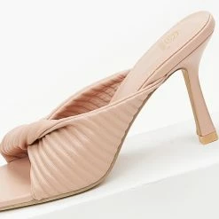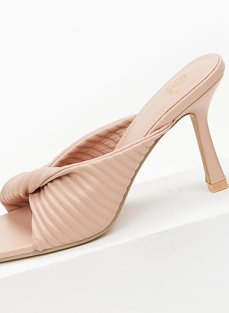 Mules καπιτονέ με σχέδιο κόμπο στη φάσα.Έχουν καρέ γραμμή και ψηλό λεπτό τακούνι.