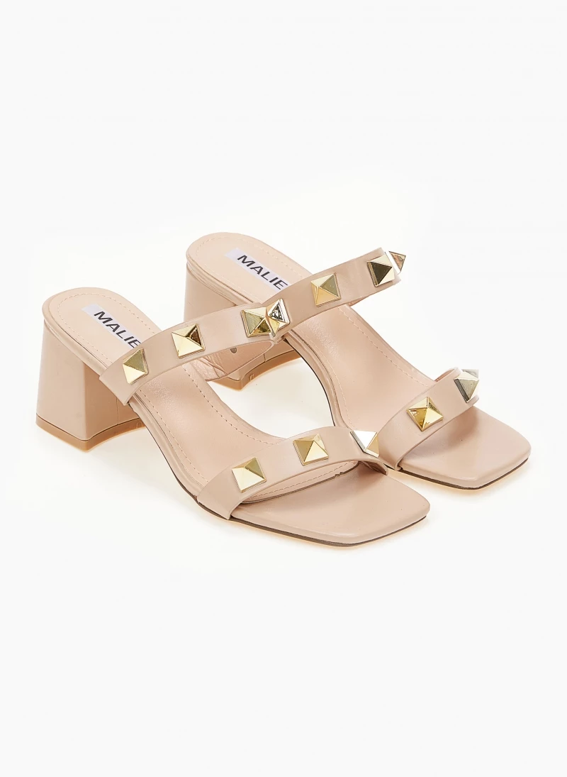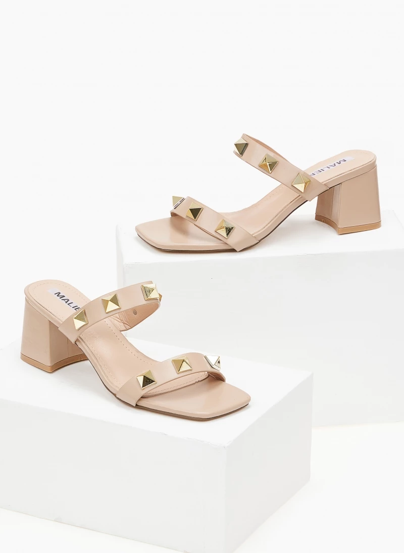 Mules σε καρέ γραμμή με χοντρό τακούνι.Έχουν λεπτά λουράκια με μεταλλικά τρουκς.