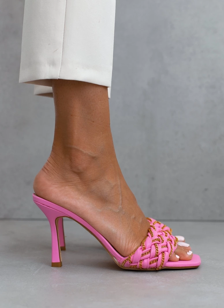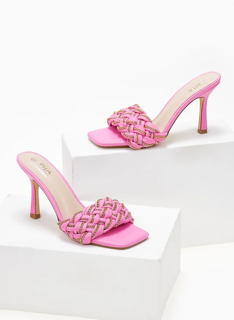 Mules με πλεκτό σχέδιο στη φάσα. Έχουν λεπτομέρεια λεπτή περαστή αλυσίδα. Ψηλό λεπτό τακούνι.. Καρέ γραμμή.