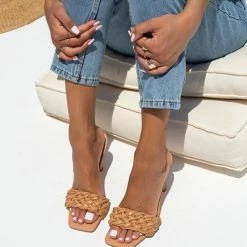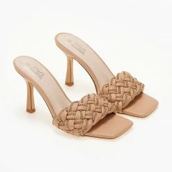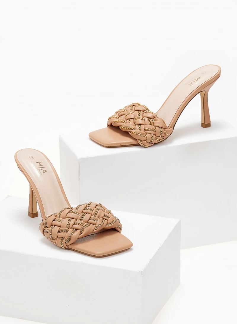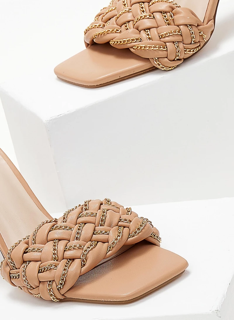 Mules με πλεκτό σχέδιο στη φάσα. Έχουν λεπτομέρεια λεπτή περαστή αλυσίδα. Ψηλό λεπτό τακούνι.. Καρέ γραμμή.