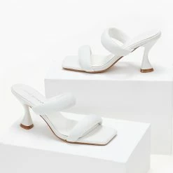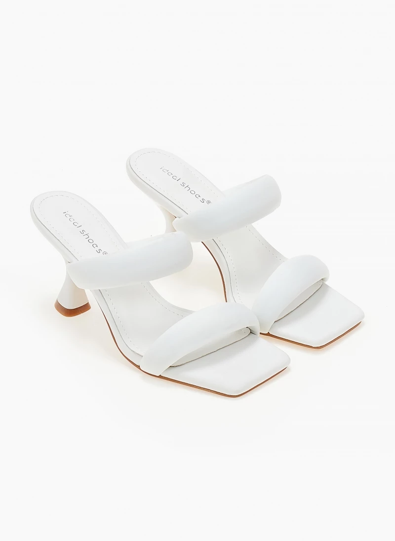 Mules με puffed φάσες. Έχουν λεπτό τακούνι. Καρέ γραμμή.