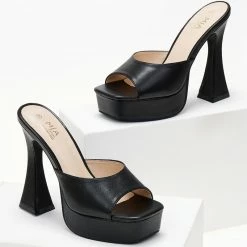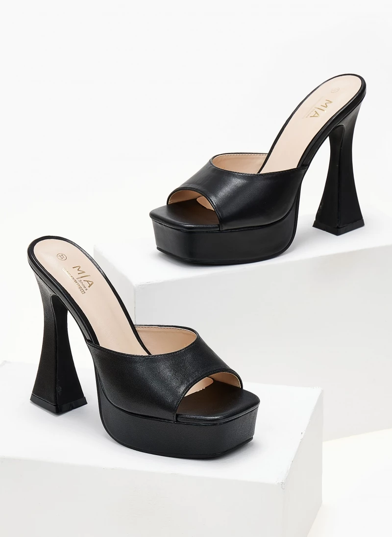 Mules σε καρέ γραμμή με φιάπα. Έχουν ψηλό τακούνι καμπάνα.