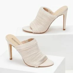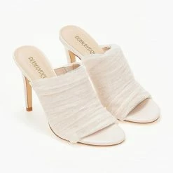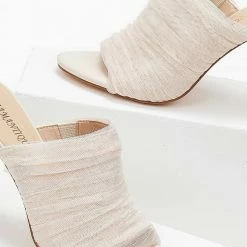 Mules με φαρδιά φάσα ντυμένη με τούλι. Έχουν διακριτικό λάστιχο στην εσωτερική τους πλευρά. Ψηλό λεπτό τακούνι.