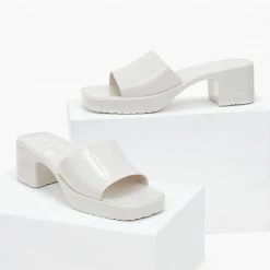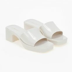 Mules σε καρέ γραμμή.Έχει χοντρή φάσα στο κουτεπιέ και χοντρό τακούνι.