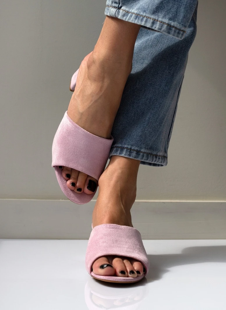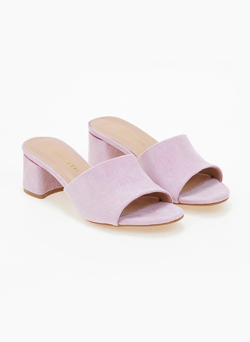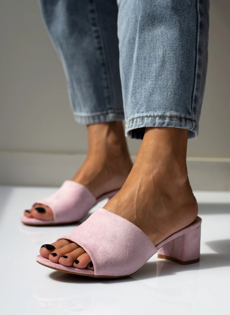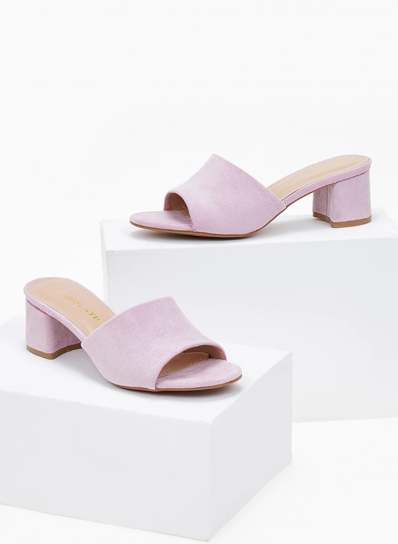 Mules suede με φαρδιά φάσα. Έχουν χαμηλό και χοντρό τακούνι.