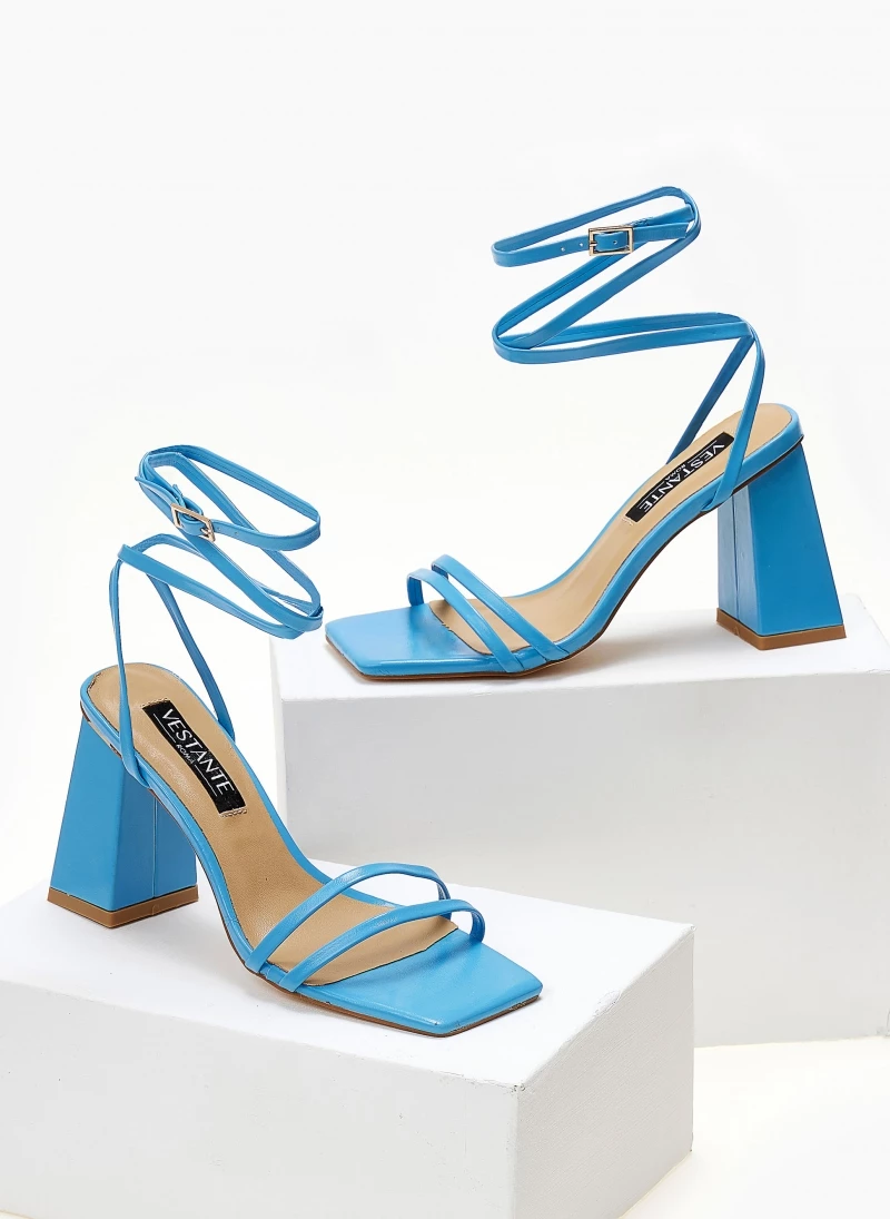 Πέδιλα σε καρέ γραμμή. Δένουν με διπλή μπαρέτα στο ύψος του αστραγάλου.