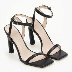 Πέδιλα σε καρέ γραμμή με ψηλό τακούνι.Δένουν με λουράκι στο ύψος του αστραγάλου.