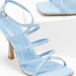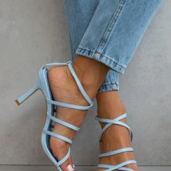 Πέδιλα με λεπτά λουράκια. Έχουν χιαστί δέσιμο στο ύψος του κουτεπιέ. Ψηλό λεπτό τακούνι. Καρέ γραμμή.