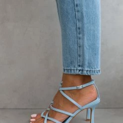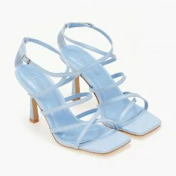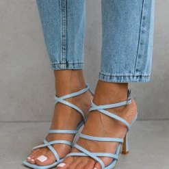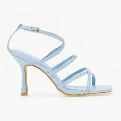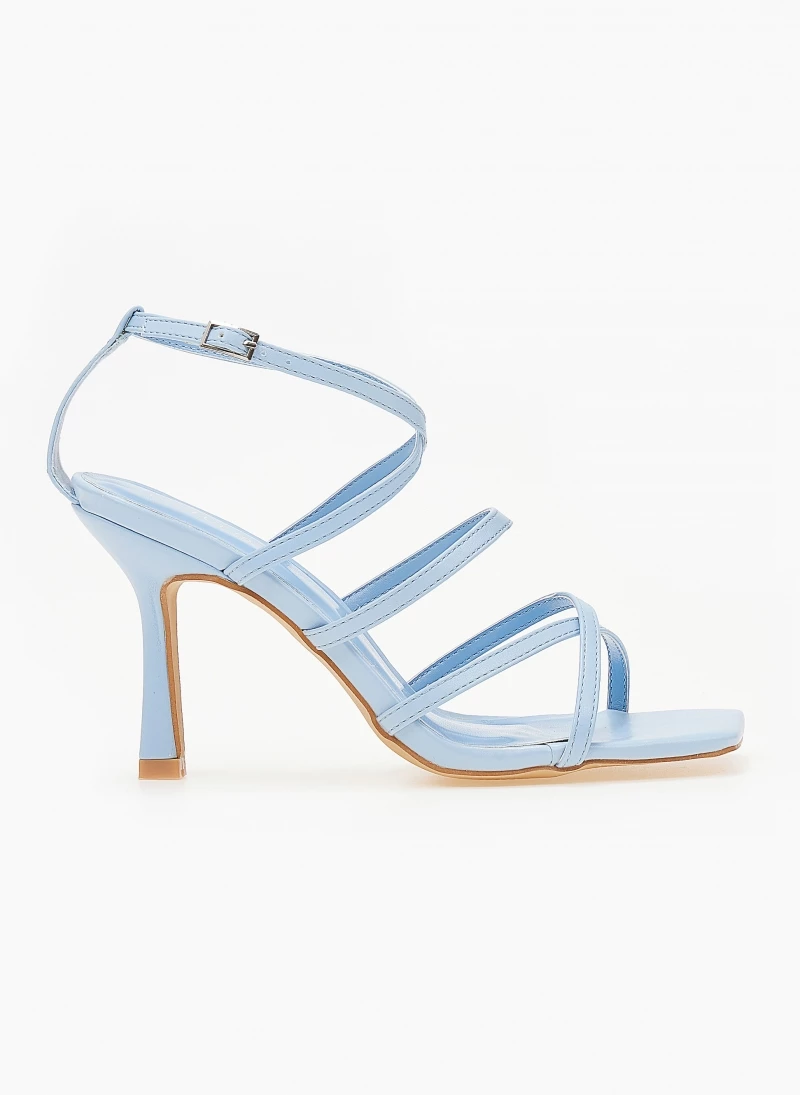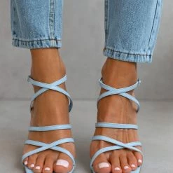 Πέδιλα με λεπτά λουράκια. Έχουν χιαστί δέσιμο στο ύψος του κουτεπιέ. Ψηλό λεπτό τακούνι. Καρέ γραμμή.