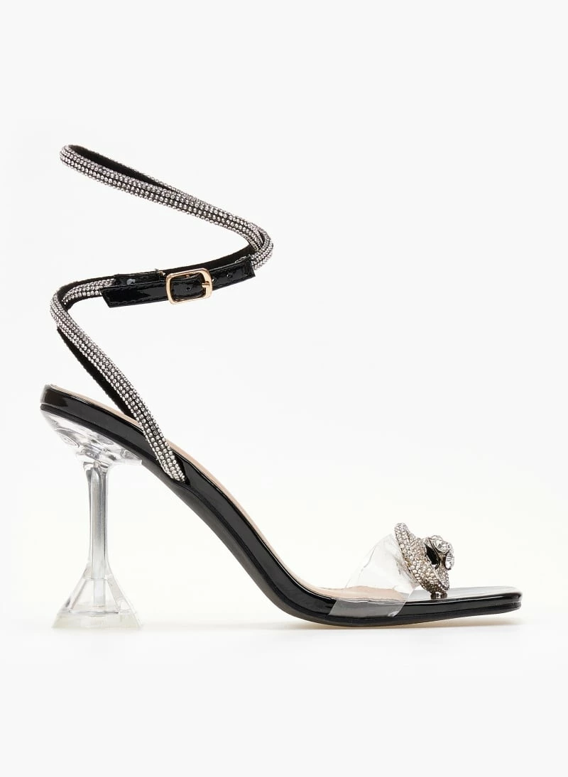 Πέδιλα με διαφάνεια και σχέδιο φιόγκο από strass. Δένουν με λουράκια σπο strass στο ύψος του αστραγάλου. Έχει ιδιαίτερο τακούνι.
