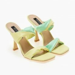Πέδιλα με ψηλό λεπτό τακούνι. Έχουν στριφτές φάσες σε συνδυασμούς χρωμάτων. Καρέ γραμμή.