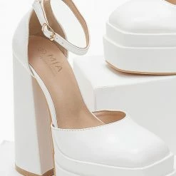 Πέδιλα με διπλή φιάπα. Έχουν κλειστή φτέρνα. Δένουν με μπαρέτα στο ύψος του αστραγάλου. Ψηλό τετράγωνο τακούνι. Καρέ γραμμή.