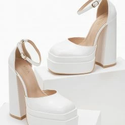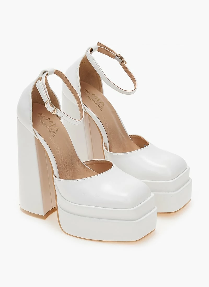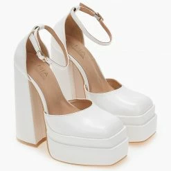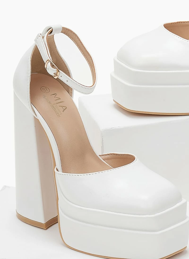 Πέδιλα με διπλή φιάπα. Έχουν κλειστή φτέρνα. Δένουν με μπαρέτα στο ύψος του αστραγάλου. Ψηλό τετράγωνο τακούνι. Καρέ γραμμή.