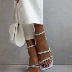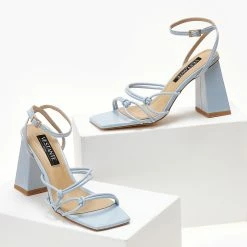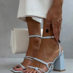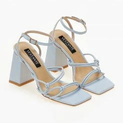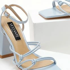 Πέδιλα με λεπτά λουράκια και σχέδιο κόμπους στο πλάι. Δένουν με μπαρέτα στο ύψος του αστραγάλου. Έχουν ιδιαίτερο χοντρό τακούνι. Καρέ γραμμή.