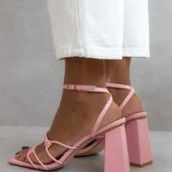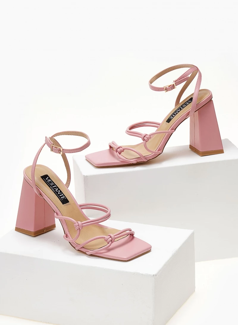Πέδιλα με λεπτά λουράκια και σχέδιο κόμπους στο πλάι. Δένουν με μπαρέτα στο ύψος του αστραγάλου. Έχουν ιδιαίτερο χοντρό τακούνι. Καρέ γραμμή.