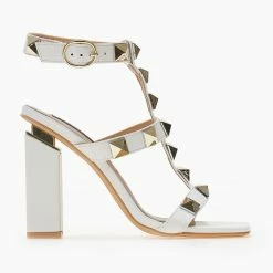 Πέδιλα με ψηλό χοντρό τακούνι. Έχουν διακοσμητικά μεταλλικά τρουκς. Δένουν με μπαρέτα στο ύψος του αστραγάλου. Καρέ γραμμή.