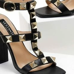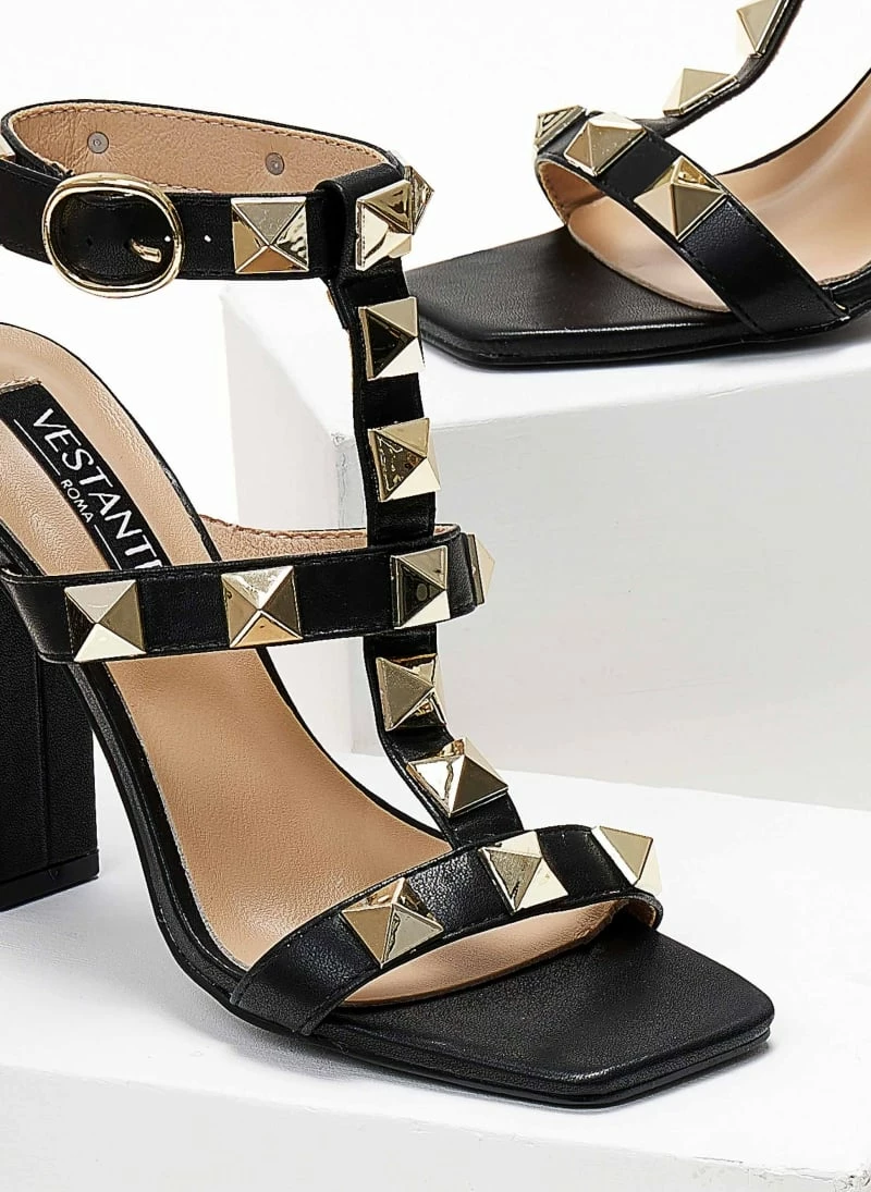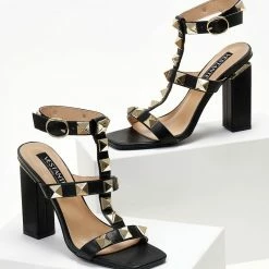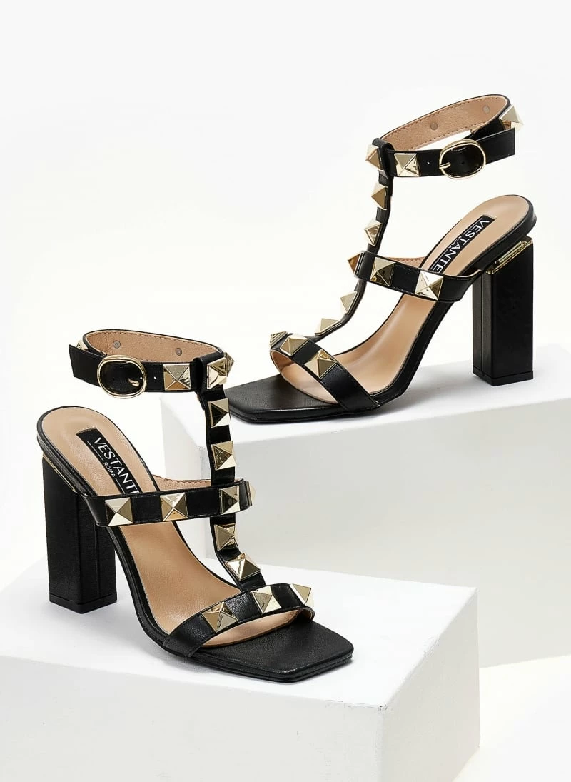 Πέδιλα με ψηλό χοντρό τακούνι. Έχουν διακοσμητικά μεταλλικά τρουκς. Δένουν με μπαρέτα στο ύψος του αστραγάλου. Καρέ γραμμή.