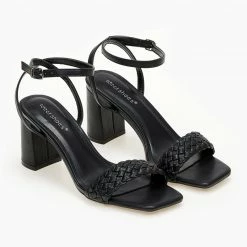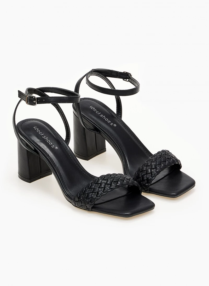 Πέδιλα σε καρέ γραμμή με πλεκτό σχέδιο στη φάσα.Έχουν φαρδύ τακούνι.Δένουν με μπαρέτα στο ύψος του αστραγάλου.
