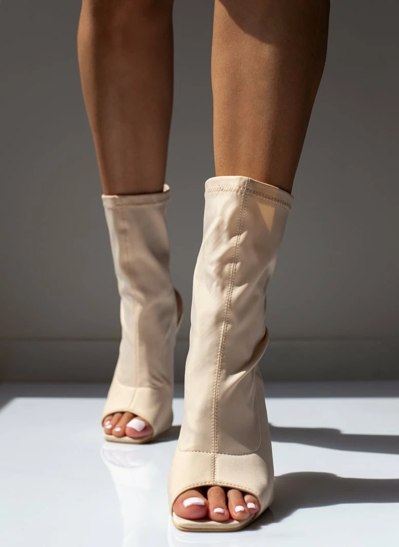 Πέδιλα μποτάκια με ελαστικό ύφασμα στη γάμπα. Έχουν ανοιχτή φτέρνα και καρέ γραμμή. Ψηλό μεταλλικό τακούνι.