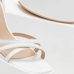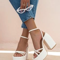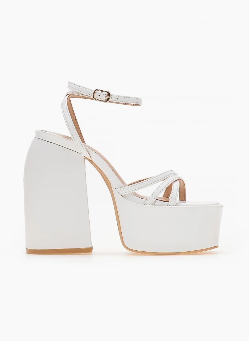 Πέδιλα platform με μπαρέτα και λουράκια χιαστί. Έχουν ψηλή φιάπα. Χοντρό τακούνι με ιδιαίτερο σχήμα.