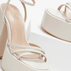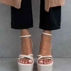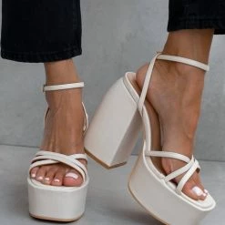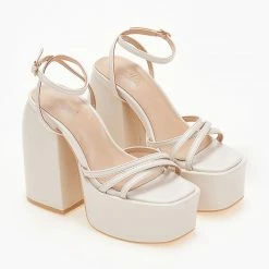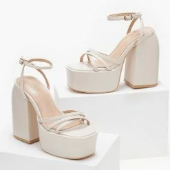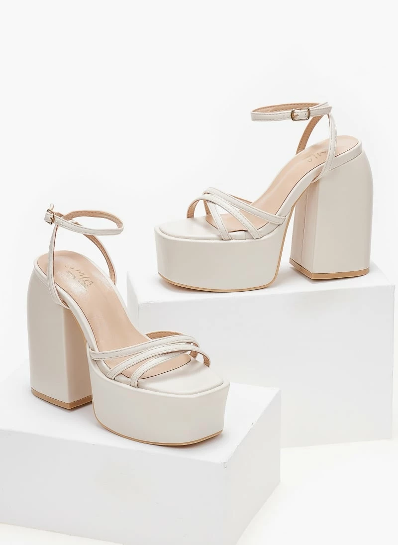 Πέδιλα platform με μπαρέτα και λουράκια χιαστί. Έχουν ψηλή φιάπα. Χοντρό τακούνι με ιδιαίτερο σχήμα.