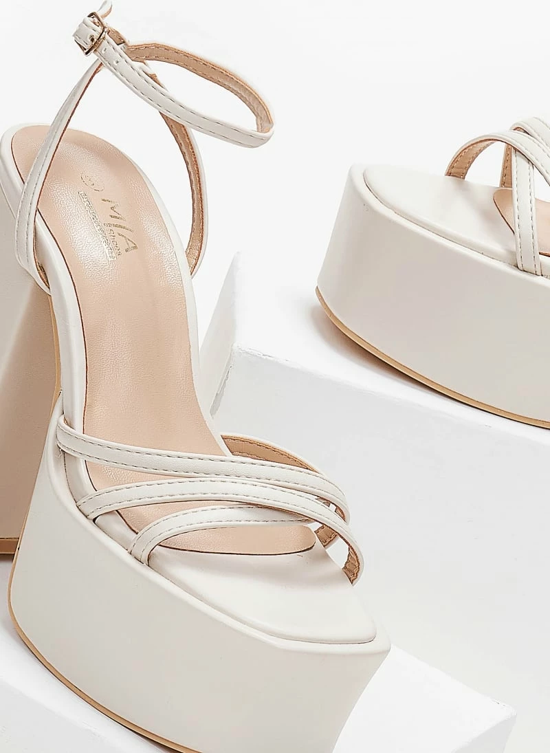 Πέδιλα platform με μπαρέτα και λουράκια χιαστί. Έχουν ψηλή φιάπα. Χοντρό τακούνι με ιδιαίτερο σχήμα.