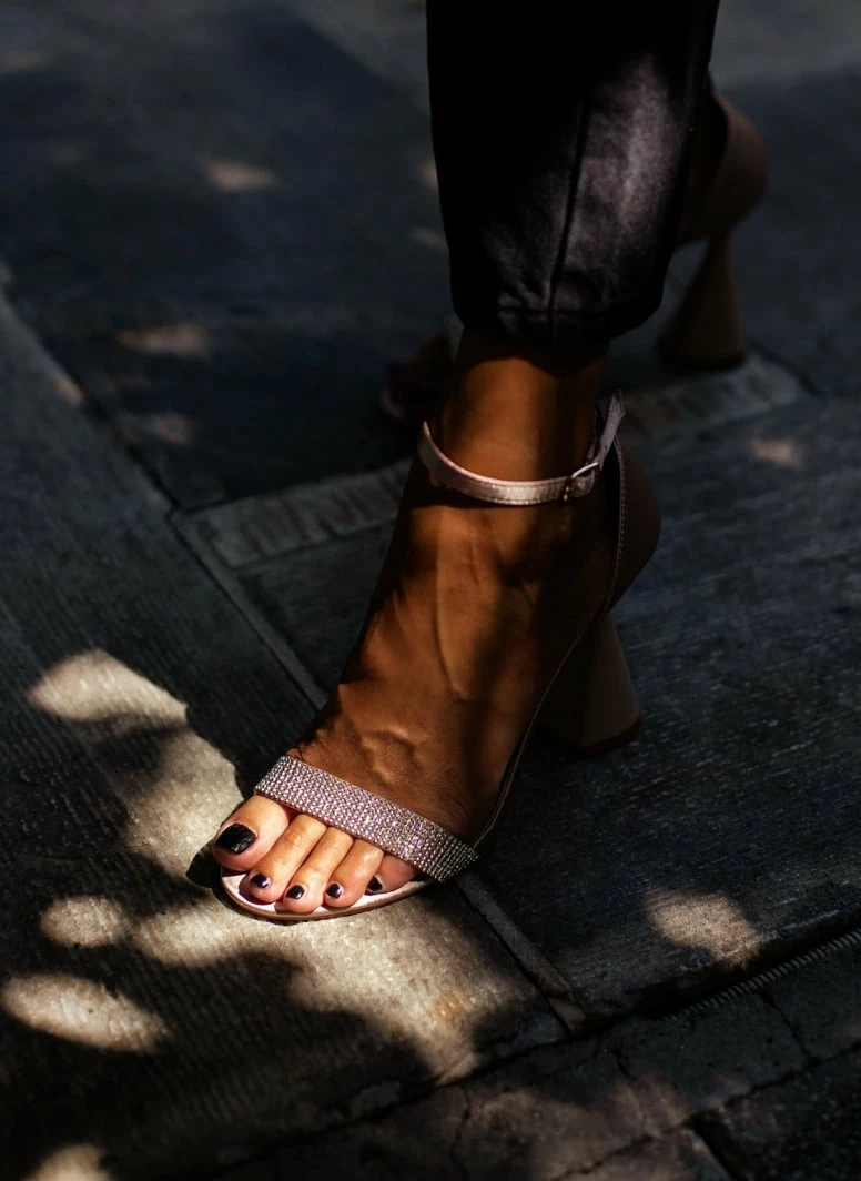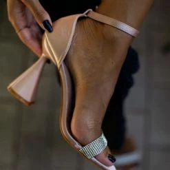 Πέδιλα σατέν με τακούνι καμπάνα. Έχουν strass φάσα. Η φτέρνα είναι κλειστή. Δένουν με μπαρέτα στο ύψος του αστραγάλου.
