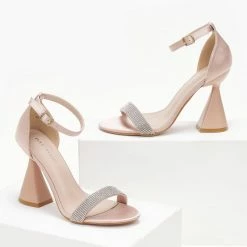 Πέδιλα σατέν με τακούνι καμπάνα. Έχουν strass φάσα. Η φτέρνα είναι κλειστή. Δένουν με μπαρέτα στο ύψος του αστραγάλου.