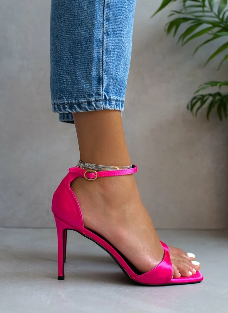 Πέδιλα σατέν με ψηλό λεπτό τακούνι. Έοχυν κλειστή φτέρνα. Δένουν με μπαρέτα στο ύψος του αστραγάλου. Καρέ γραμμή.
