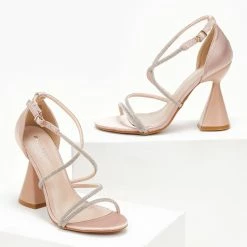 Πέδιλα σατέν με strass. Έχουν ψηλό τακούνι καμπάνα. Η φτέρνα είναι κλειστή. Δένουν με χιαστί strass λουράκια στο κουτεπιέ.