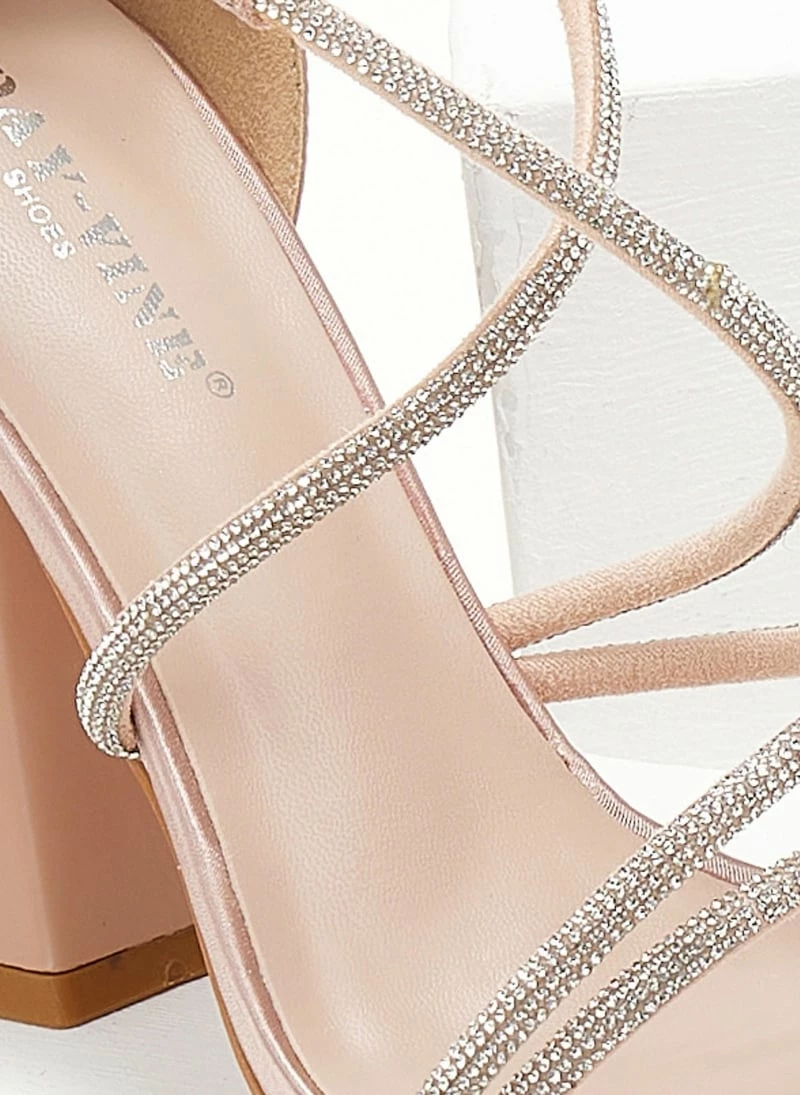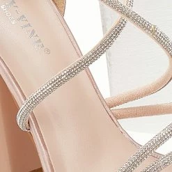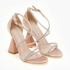 Πέδιλα σατέν με strass. Έχουν ψηλό τακούνι καμπάνα. Η φτέρνα είναι κλειστή. Δένουν με χιαστί strass λουράκια στο κουτεπιέ.