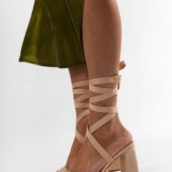 Πέδιλα suede με δέσιμο στη γάμπα.Έχουν λεπτή φάσα και ψηλό τετράγωνο τακούνι.
