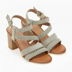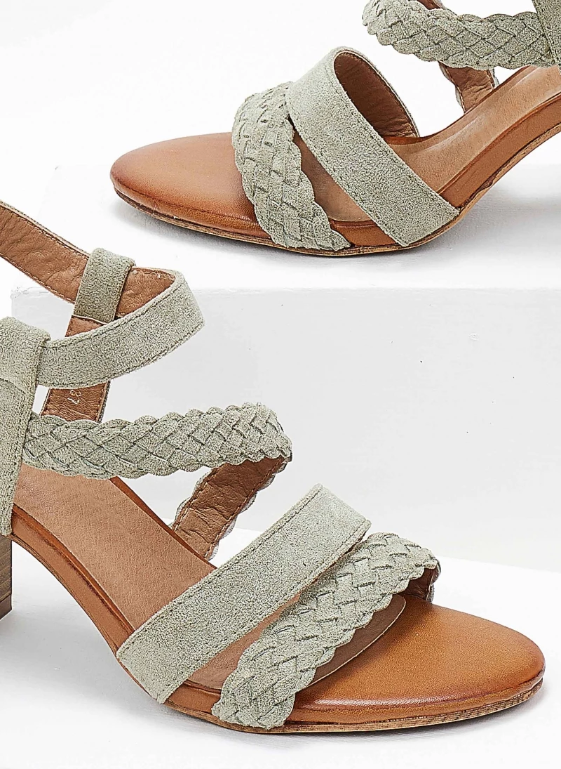 Πέδιλα suede με πλεκτό σχέδιο στα λουράκια. Έχουν χοντρό ξύλινο τακούνι. Δένουν στο πλάι με λουράκι. Στρογγυλή γραμμή.