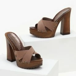 Τσόκαρα από nubuck δέρμα με χιαστί φάσες. Έχουν ψηλό τακούνι με φιάπα και μεταλλικά τρουκς.